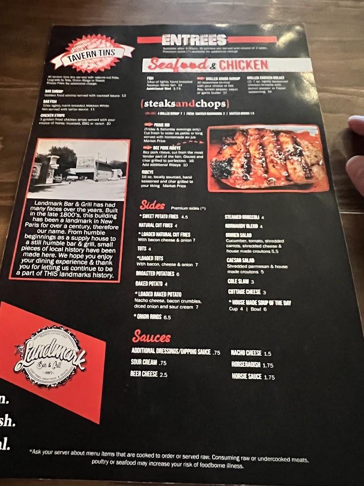 Welcome to Landmark Bar & Grill, your go-to spot in New Paris, IN! Nestled on Main Street, we offer a delightful menu featuring traditional grill fare, perfect for lunch or dinner. Enjoy our extensive selection of beers and expertly crafted cocktails in a relaxed, historic setting. Whether you're dining solo, with friends, or hosting a group, our fast service and welcoming ambiance make every visit memorable. Take advantage of our happy hour specials and engage in fun activities like karaoke and sports. With wheelchair accessibility and takeout options available, Landmark Bar & Grill is here to cater to all your dining needs!